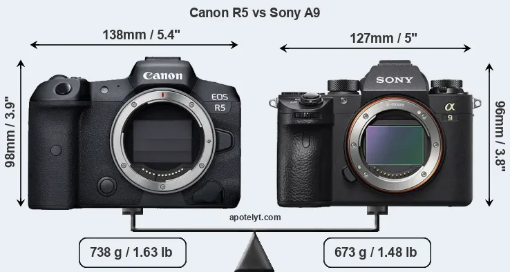 An illustration of the physical size and weight of the Canon R5 and the Sony A9 is provided in the side-by-side display below. The two cameras are presented according to their relative size. Three successive views from the front, the top, and the rear are shown. All size dimensions are rounded to the nearest millimeter.