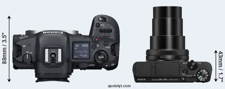 The side-by-side display below illustrates the physical size and weight of the Canon R5 and the Sony RX100 VI. The two cameras are presented according to their relative size. Three consecutive perspectives from the front, the top, and the back are available. All width, height and depth dimensions are rounded to the nearest millimeter.