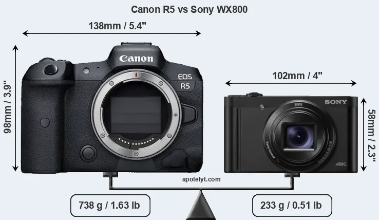 The physical size and weight of the Canon R5 and the Sony WX800 are illustrated in the side-by-side display below. The two cameras are presented according to their relative size. Three successive views from the front, the top, and the rear are shown. All width, height and depth measures are rounded to the nearest millimeter.