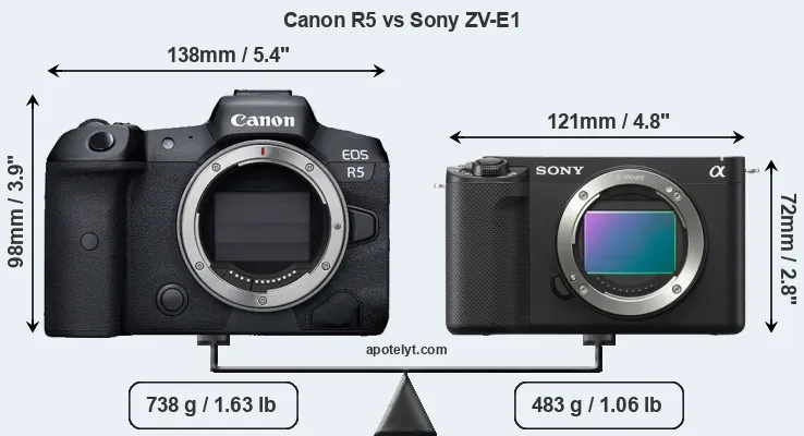 The side-by-side display below illustrates the physical size and weight of the Canon R5 and the Sony ZV-E1. The two cameras are presented according to their relative size. Three consecutive views from the front, the top, and the rear side are shown. All width, height and depth dimensions are rounded to the nearest millimeter.