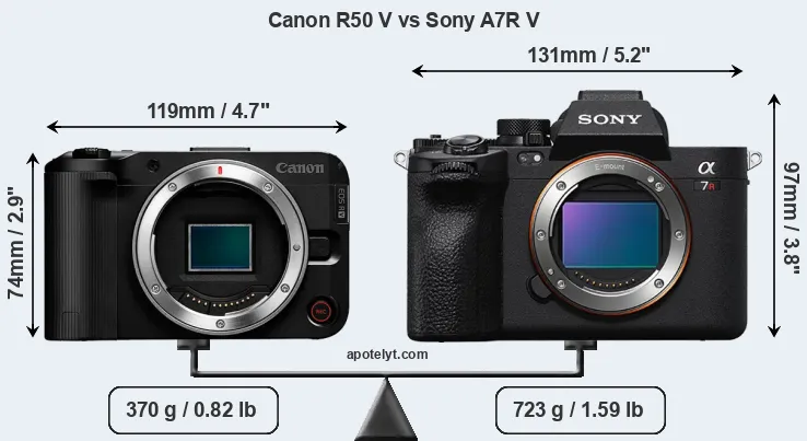 If the front view area (width x height) of the cameras is taken as an aggregate measure of their size, the Sony A7R V is considerably larger (44 percent) than the Canon R50 V. Moreover, the A7R V is substantially heavier (95 percent) than the R50 V. It is noteworthy in this context that the A7R V is splash and dust-proof, while the R50 V does not feature any corresponding weather-sealing.