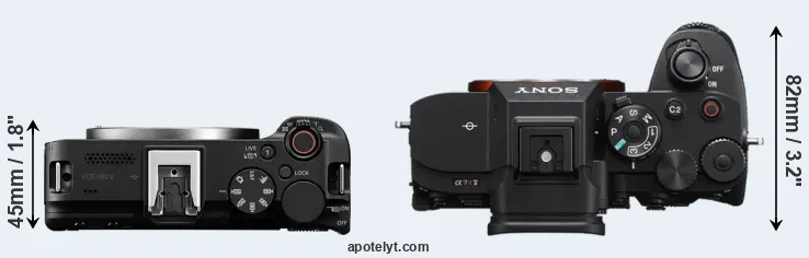 An illustration of the physical size and weight of the Canon R50 V and the Sony A7R V is provided in the side-by-side display below. The two cameras are presented according to their relative size. Three consecutive views from the front, the top, and the rear side are shown. All width, height and depth measures are rounded to the nearest millimeter.
