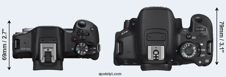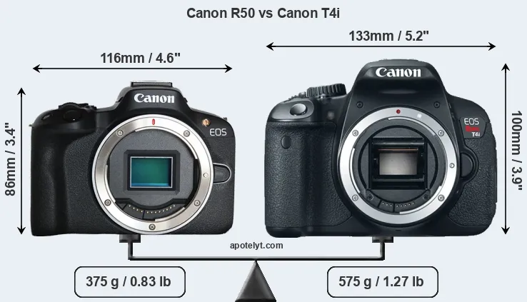 The side-by-side display below illustrates the physical size and weight of the Canon R50 and the Canon T4i. The two cameras are presented according to their relative size. Three consecutive views from the front, the top, and the rear side are shown. All width, height and depth dimensions are rounded to the nearest millimeter.