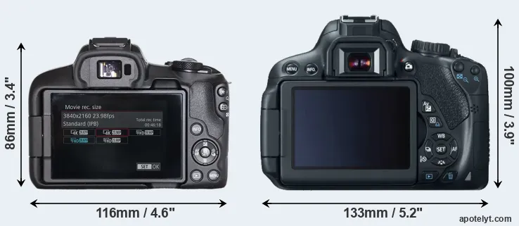The Canon EOS R50 and the Canon EOS Rebel T4i (labelled Canon 650D in some countries) are two digital cameras that were officially introduced, respectively, in February 2023 and June 2012. The R50 is a mirrorless interchangeable lens camera, while the T4i is a DSLR. Both cameras are equipped with an APS-C sensor. The R50 has a resolution of 24 megapixels, whereas the T4i provides 17.9 MP.
