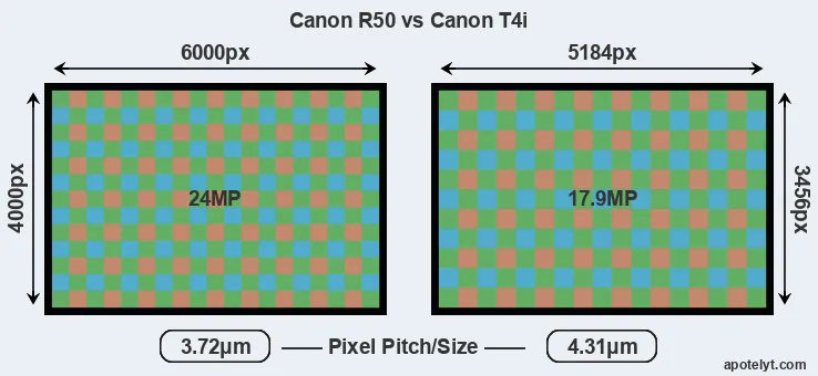 While the two cameras under review share the same sensor size, the R50 offers a higher resolution of 24 megapixels, compared with 17.9 MP of the T4i. This megapixels advantage translates into a 16 percent gain in linear resolution. On the other hand, these sensor specs imply that the R50 has a higher pixel density and a smaller size of the individual pixel (with a pixel pitch of 3.72μm versus 4.31μm for the T4i). In this context, it should be noted, however, that the R50 is much more recent (by 10 years and 8 months) than the T4i, and its sensor will have benefitted from technological advances during this time that compensate for the smaller pixel size.