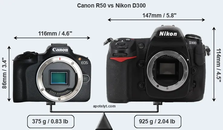 If the front view area (width x height) of the cameras is taken as an aggregate measure of their size, the Nikon D300 is considerably larger (68 percent) than the Canon R50. Moreover, the D300 is substantially heavier (147 percent) than the R50. It is noteworthy in this context that the D300 is splash and dust-proof, while the R50 does not feature any corresponding weather-sealing.