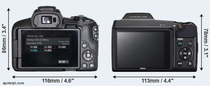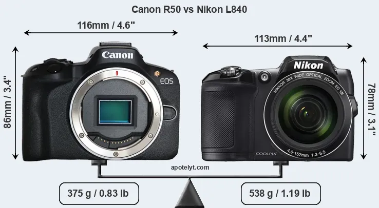 The side-by-side display below illustrates the physical size and weight of the Canon R50 and the Nikon L840. The two cameras are presented according to their relative size. Three consecutive perspectives from the front, the top, and the back are available. All width, height and depth dimensions are rounded to the nearest millimeter.
