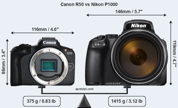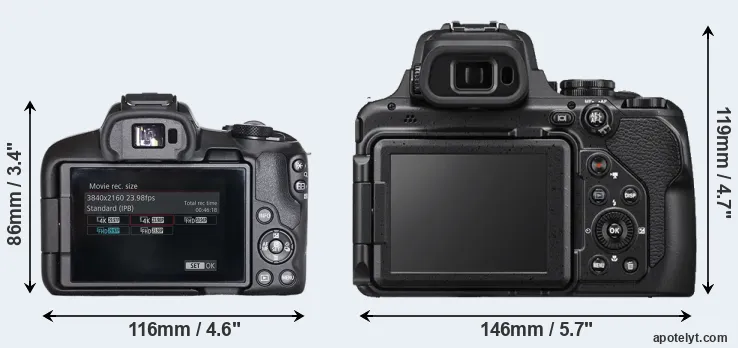 The above size and weight comparisons are to some extent incomplete and possibly misleading, as the P1000 has a lens built in, whereas the R50 is an interchangeable lens camera that requires a separate lens. Attaching the latter will add extra weight and bulk to the setup.