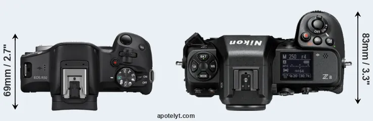 The side-by-side display below illustrates the physical size and weight of the Canon R50 and the Nikon Z8. The two cameras are presented according to their relative size. Three consecutive perspectives from the front, the top, and the back are available. All size dimensions are rounded to the nearest millimeter.
