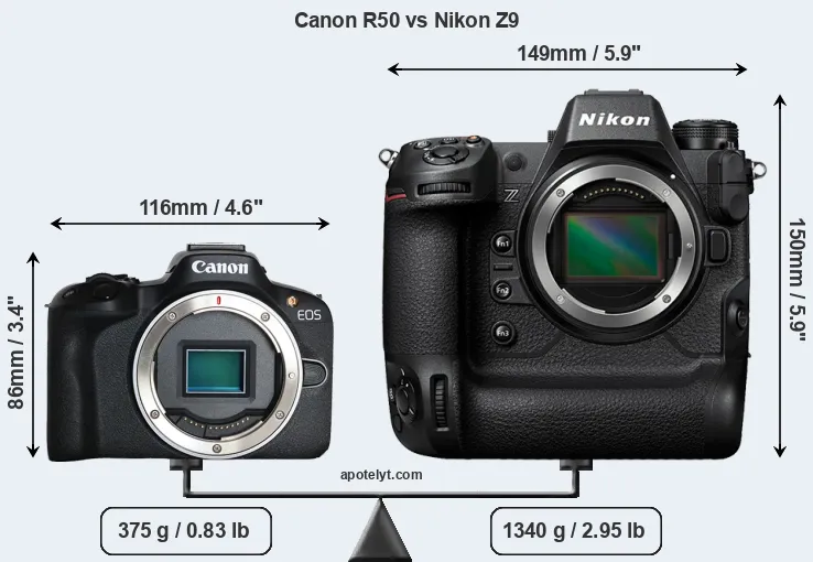 If the front view area (width x height) of the cameras is taken as an aggregate measure of their size, the Nikon Z9 is considerably larger (124 percent) than the Canon R50. Moreover, the Z9 is substantially heavier (257 percent) than the R50. It is noteworthy in this context that the Z9 is splash and dust-proof, while the R50 does not feature any corresponding weather-sealing.