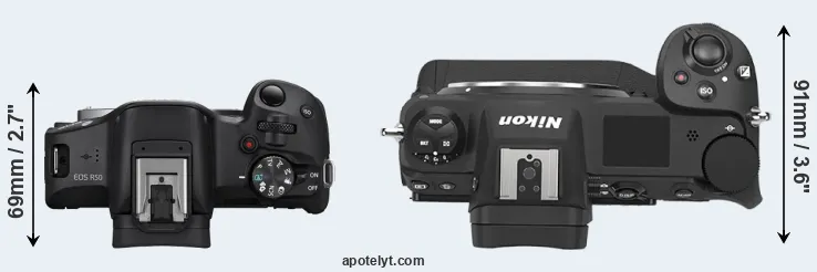 The side-by-side display below illustrates the physical size and weight of the Canon R50 and the Nikon Z9. The two cameras are presented according to their relative size. Three consecutive perspectives from the front, the top, and the back are available. All size dimensions are rounded to the nearest millimeter.