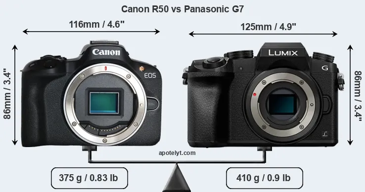 If the front view area (width x height) of the cameras is taken as an aggregate measure of their size, the Panasonic G7 is notably larger (8 percent) than the Canon R50. Moreover, the G7 is markedly heavier (9 percent) than the R50. In this context, it is worth noting that neither the R50 nor the G7 are weather-sealed.