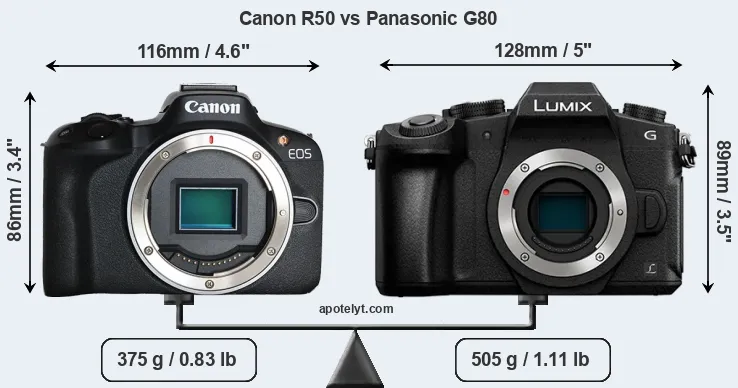 If the front view area (width x height) of the cameras is taken as an aggregate measure of their size, the Panasonic G80 is notably larger (14 percent) than the Canon R50. Moreover, the G80 is substantially heavier (35 percent) than the R50. It is noteworthy in this context that the G80 is splash and dust-proof, while the R50 does not feature any corresponding weather-sealing.