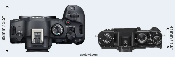 The side-by-side display below illustrates the physical size and weight of the Canon R6 Mark II and the Fujifilm X-T20. The two cameras are presented according to their relative size. Three consecutive perspectives from the front, the top, and the back are available. All width, height and depth measures are rounded to the nearest millimeter.