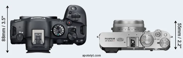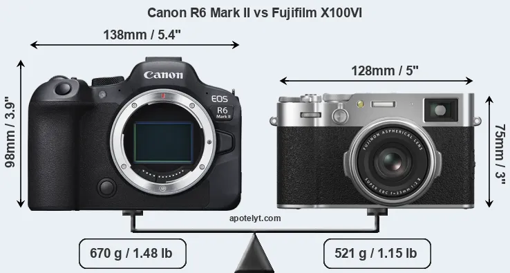 The physical size and weight of the Canon R6 Mark II and the Fujifilm X100VI are illustrated in the side-by-side display below. The two cameras are presented according to their relative size. Three consecutive views from the front, the top, and the rear side are shown. All width, height and depth measures are rounded to the nearest millimeter.