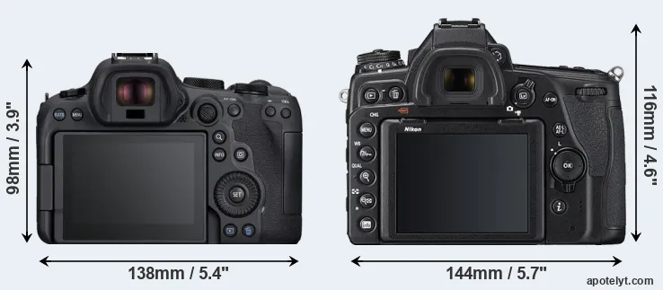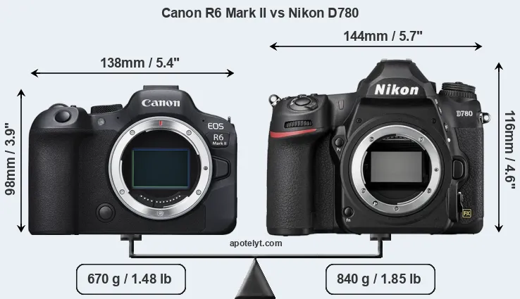 The side-by-side display below illustrates the physical size and weight of the Canon R6 Mark II and the Nikon D780. The two cameras are presented according to their relative size. Three consecutive perspectives from the front, the top, and the back are available. All width, height and depth measures are rounded to the nearest millimeter.