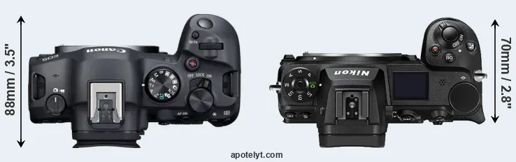 The physical size and weight of the Canon R6 Mark II and the Nikon Z7 II are illustrated in the side-by-side display below. The two cameras are presented according to their relative size. Three successive views from the front, the top, and the rear are shown. All width, height and depth dimensions are rounded to the nearest millimeter.