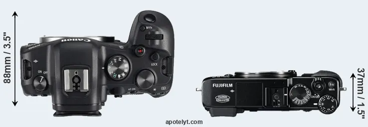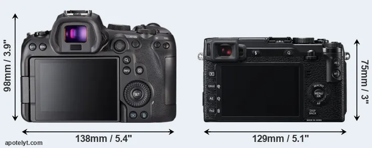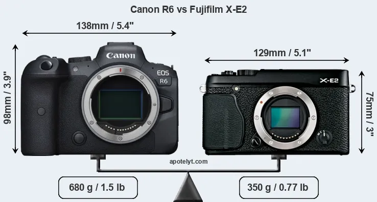 The physical size and weight of the Canon R6 and the Fujifilm X-E2 are illustrated in the side-by-side display below. The two cameras are presented according to their relative size. Three consecutive perspectives from the front, the top, and the back are available. All width, height and depth dimensions are rounded to the nearest millimeter.