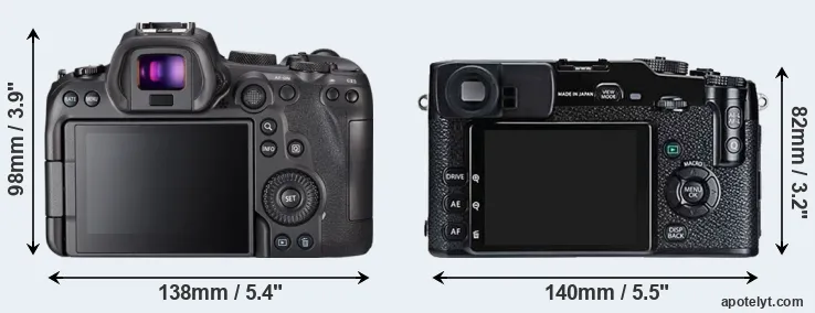The side-by-side display below illustrates the physical size and weight of the Canon R6 and the Fujifilm X-Pro1. The two cameras are presented according to their relative size. Three successive views from the front, the top, and the rear are shown. All width, height and depth dimensions are rounded to the nearest millimeter.