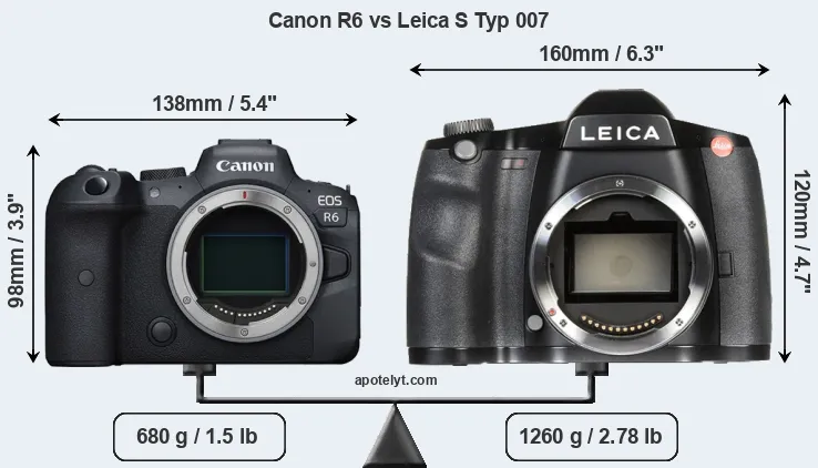 Going beyond this snapshot of core features and characteristics, what are the differences between the Canon EOS R6 and the Leica S (Typ 007)? Which one should you buy? Read on to find out how these two cameras compare with respect to their body size, their imaging sensors, their shooting features, their input-output connections, and their reception by expert reviewers.