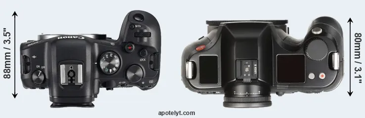 The physical size and weight of the Canon R6 and the Leica S Typ 007 are illustrated in the side-by-side display below. The two cameras are presented according to their relative size. Three consecutive views from the front, the top, and the rear side are shown. All size dimensions are rounded to the nearest millimeter.