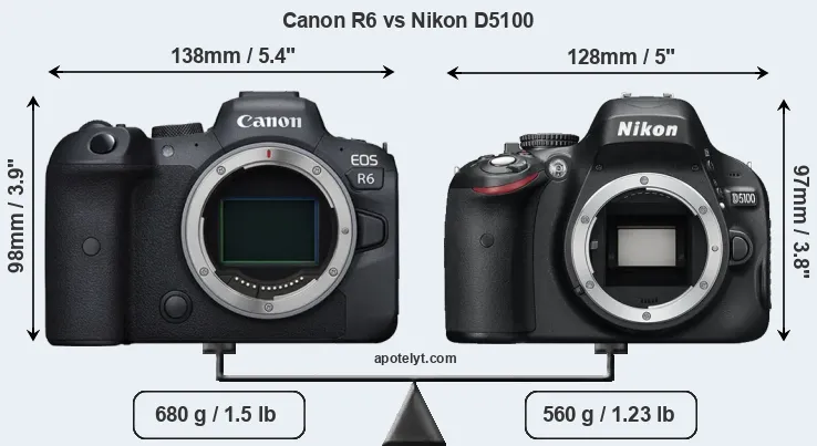 The side-by-side display below illustrates the physical size and weight of the Canon R6 and the Nikon D5100. The two cameras are presented according to their relative size. Three consecutive perspectives from the front, the top, and the back are available. All width, height and depth measures are rounded to the nearest millimeter.
