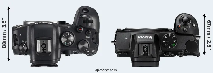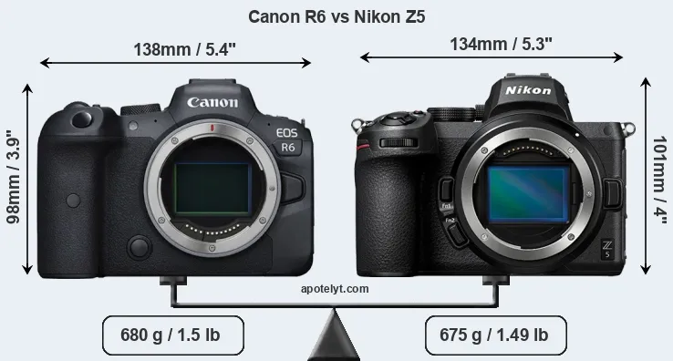 The side-by-side display below illustrates the physical size and weight of the Canon R6 and the Nikon Z5. The two cameras are presented according to their relative size. Three successive views from the front, the top, and the rear are shown. All size dimensions are rounded to the nearest millimeter.