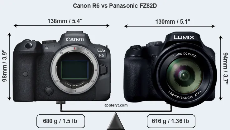 The physical size and weight of the Canon R6 and the Panasonic FZ82D are illustrated in the side-by-side display below. The two cameras are presented according to their relative size. Three consecutive perspectives from the front, the top, and the back are available. All width, height and depth dimensions are rounded to the nearest millimeter.