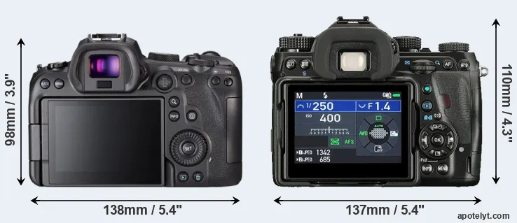 The physical size and weight of the Canon R6 and the Pentax K-1 II are illustrated in the side-by-side display below. The two cameras are presented according to their relative size. Three consecutive perspectives from the front, the top, and the back are available. All width, height and depth dimensions are rounded to the nearest millimeter.