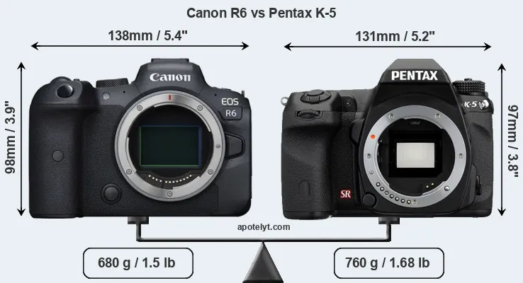 The side-by-side display below illustrates the physical size and weight of the Canon R6 and the Pentax K-5. The two cameras are presented according to their relative size. Three consecutive perspectives from the front, the top, and the back are available. All width, height and depth measures are rounded to the nearest millimeter.