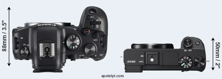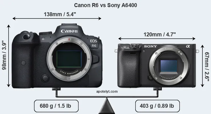 The physical size and weight of the Canon R6 and the Sony A6400 are illustrated in the side-by-side display below. The two cameras are presented according to their relative size. Three successive views from the front, the top, and the rear are shown. All width, height and depth measures are rounded to the nearest millimeter.