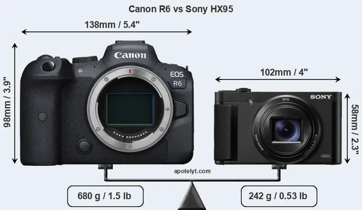 The side-by-side display below illustrates the physical size and weight of the Canon R6 and the Sony HX95. The two cameras are presented according to their relative size. Three consecutive views from the front, the top, and the rear side are shown. All width, height and depth measures are rounded to the nearest millimeter.