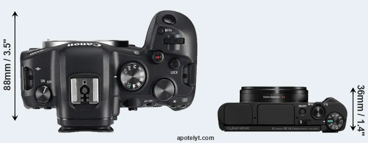 The above size and weight comparisons are to some extent incomplete and possibly misleading, as the HX95 has a lens built in, whereas the R6 is an interchangeable lens camera that requires a separate lens. Attaching the latter will add extra weight and bulk to the setup.