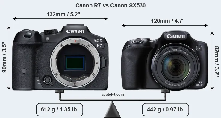 The physical size and weight of the Canon R7 and the Canon SX530 are illustrated in the side-by-side display below. The two cameras are presented according to their relative size. Three consecutive views from the front, the top, and the rear side are shown. All size dimensions are rounded to the nearest millimeter.