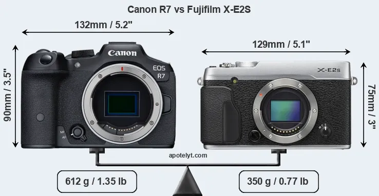 The physical size and weight of the Canon R7 and the Fujifilm X-E2S are illustrated in the side-by-side display below. The two cameras are presented according to their relative size. Three successive views from the front, the top, and the rear are shown. All width, height and depth measures are rounded to the nearest millimeter.