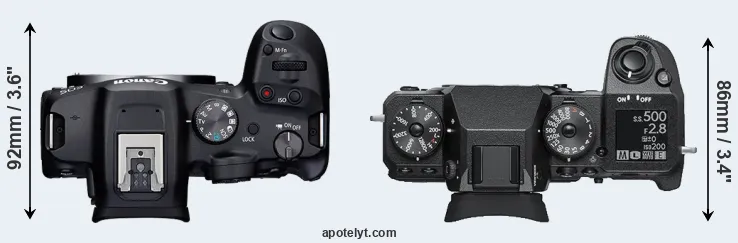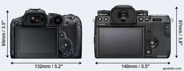 The physical size and weight of the Canon R7 and the Fujifilm X-H1 are illustrated in the side-by-side display below. The two cameras are presented according to their relative size. Three successive views from the front, the top, and the rear are shown. All width, height and depth measures are rounded to the nearest millimeter.