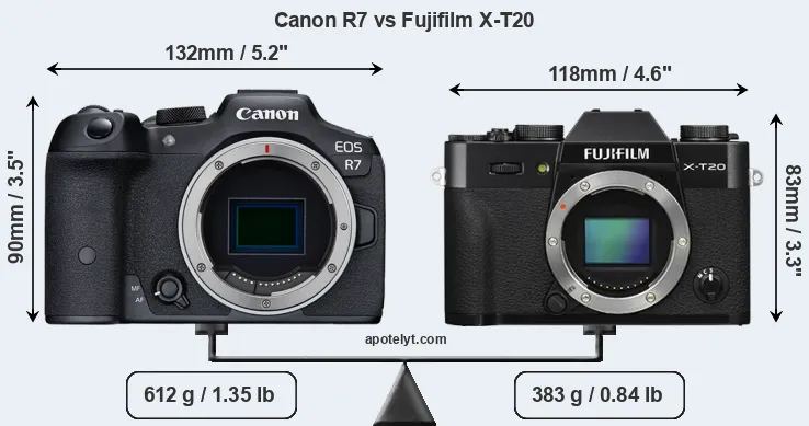 If the front view area (width x height) of the cameras is taken as an aggregate measure of their size, the Fujifilm X-T20 is notably smaller (18 percent) than the Canon R7. Moreover, the X-T20 is substantially lighter (37 percent) than the R7. It is worth mentioning in this context that the R7 is splash and dust resistant, while the X-T20 does not feature any corresponding weather-sealing.