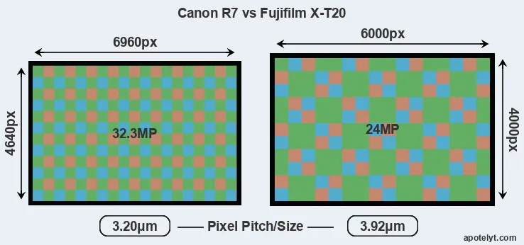 Despite having a smaller sensor, the Canon R7 offers a higher resolution of 32.3 megapixels, compared with 24 MP of the Fujifilm X-T20. This megapixels advantage comes at the cost of a higher pixel density and a smaller size of the individual pixel (with a pixel pitch of 3.20μm versus 3.92μm for the X-T20). However, it should be noted that the R7 is much more recent (by 5 years and 4 months) than the X-T20, and its sensor will have benefitted from technological advances during this time that make it possible to gather light more efficiently. Coming back to sensor resolution, it should be mentioned that the X-T20 has no anti-alias filter installed, so that it can capture all the detail its sensor resolves.