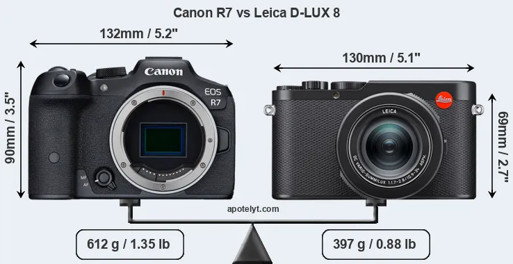 The physical size and weight of the Canon R7 and the Leica D-LUX 8 are illustrated in the side-by-side display below. The two cameras are presented according to their relative size. Three consecutive views from the front, the top, and the rear side are shown. All width, height and depth measures are rounded to the nearest millimeter.