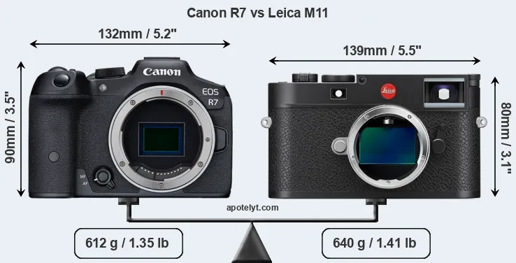 The side-by-side display below illustrates the physical size and weight of the Canon R7 and the Leica M11. The two cameras are presented according to their relative size. Three successive views from the front, the top, and the rear are shown. All width, height and depth dimensions are rounded to the nearest millimeter.