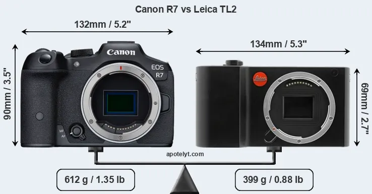 An illustration of the physical size and weight of the Canon R7 and the Leica TL2 is provided in the side-by-side display below. The two cameras are presented according to their relative size. Three consecutive views from the front, the top, and the rear side are shown. All width, height and depth dimensions are rounded to the nearest millimeter.