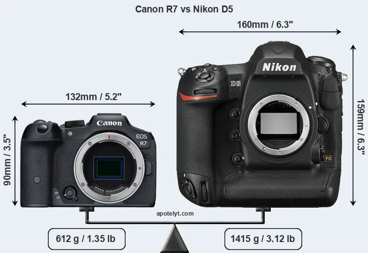 The side-by-side display below illustrates the physical size and weight of the Canon R7 and the Nikon D5. The two cameras are presented according to their relative size. Three successive views from the front, the top, and the rear are shown. All width, height and depth measures are rounded to the nearest millimeter.
