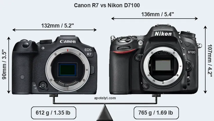 The side-by-side display below illustrates the physical size and weight of the Canon R7 and the Nikon D7100. The two cameras are presented according to their relative size. Three successive views from the front, the top, and the rear are shown. All width, height and depth dimensions are rounded to the nearest millimeter.