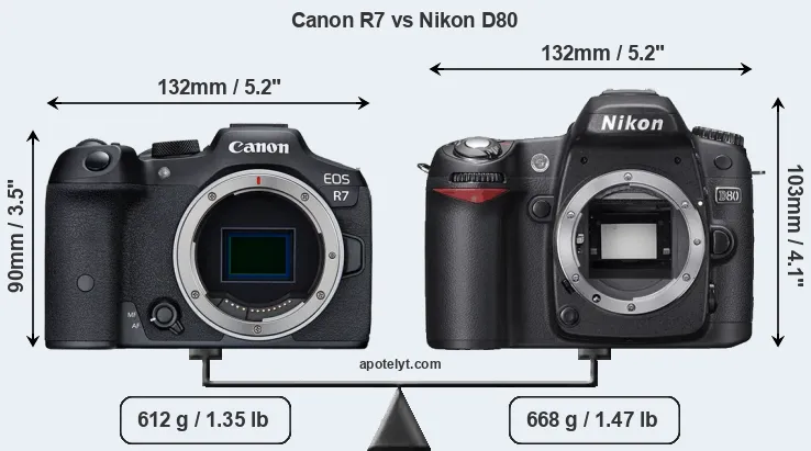 The physical size and weight of the Canon R7 and the Nikon D80 are illustrated in the side-by-side display below. The two cameras are presented according to their relative size. Three consecutive perspectives from the front, the top, and the back are available. All width, height and depth dimensions are rounded to the nearest millimeter.