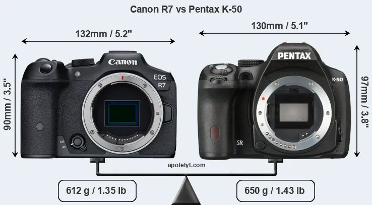 An illustration of the physical size and weight of the Canon R7 and the Pentax K-50 is provided in the side-by-side display below. The two cameras are presented according to their relative size. Three consecutive views from the front, the top, and the rear side are shown. All width, height and depth dimensions are rounded to the nearest millimeter.
