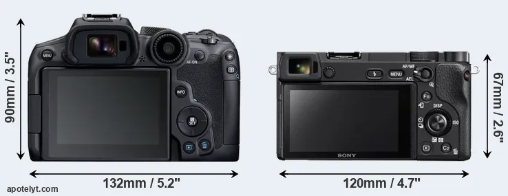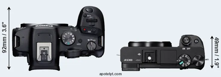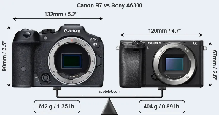 The side-by-side display below illustrates the physical size and weight of the Canon R7 and the Sony A6300. The two cameras are presented according to their relative size. Three consecutive perspectives from the front, the top, and the back are available. All size dimensions are rounded to the nearest millimeter.