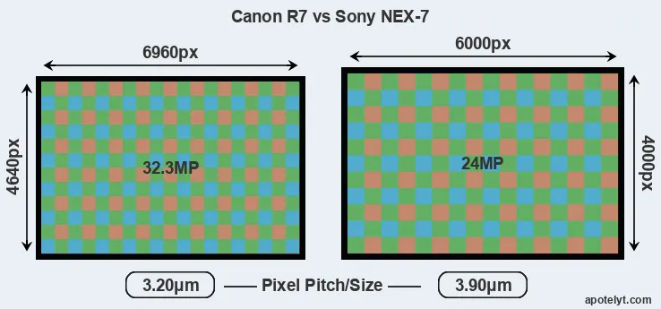 Despite having a smaller sensor, the Canon R7 offers a higher resolution of 32.3 megapixels, compared with 24 MP of the Sony NEX-7. This megapixels advantage comes at the cost of a higher pixel density and a smaller size of the individual pixel (with a pixel pitch of 3.20μm versus 3.90μm for the NEX-7). However, it should be noted that the R7 is much more recent (by 10 years and 9 months) than the NEX-7, and its sensor will have benefitted from technological advances during this time that make it possible to gather light more efficiently.