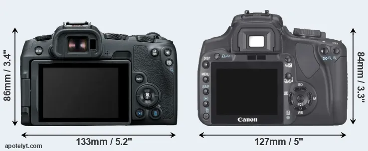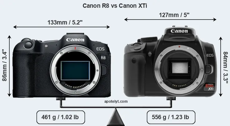 An illustration of the physical size and weight of the Canon R8 and the Canon XTi is provided in the side-by-side display below. The two cameras are presented according to their relative size. Three consecutive perspectives from the front, the top, and the back are available. All width, height and depth dimensions are rounded to the nearest millimeter.