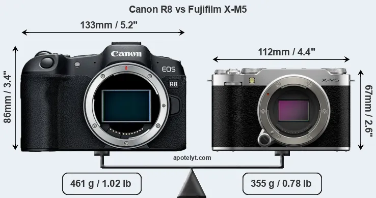 The side-by-side display below illustrates the physical size and weight of the Canon R8 and the Fujifilm X-M5. The two cameras are presented according to their relative size. Three consecutive perspectives from the front, the top, and the back are available. All width, height and depth dimensions are rounded to the nearest millimeter.