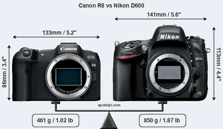The physical size and weight of the Canon R8 and the Nikon D600 are illustrated in the side-by-side display below. The two cameras are presented according to their relative size. Three consecutive views from the front, the top, and the rear side are shown. All width, height and depth measures are rounded to the nearest millimeter.
